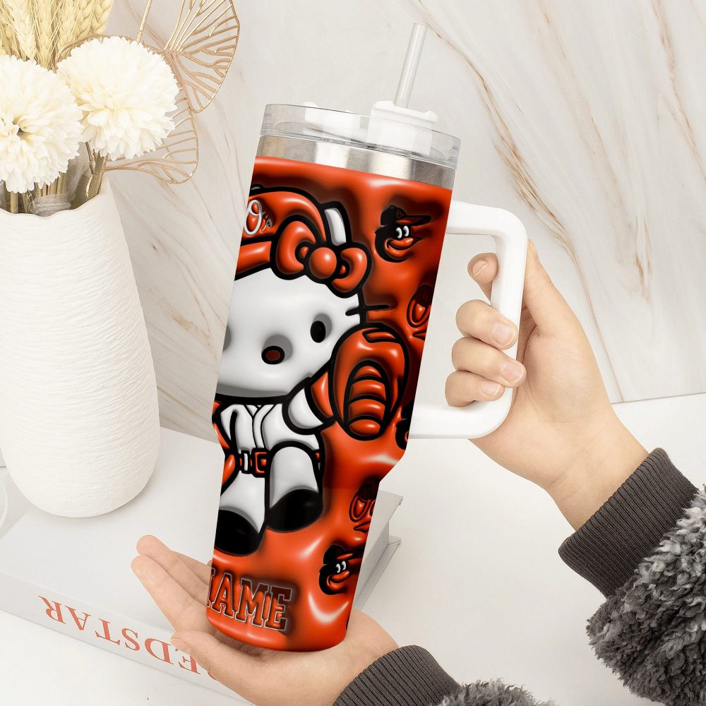 3D Hello Kitty And Baltimore Orioles Cartoon Mlb Custom Stanley Quencher 40Oz Stainless Steel Tumbler With Handle