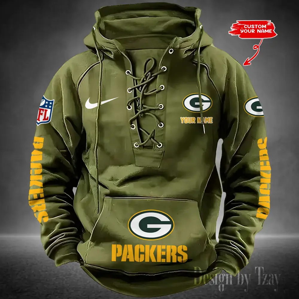 Green Bay Packers NFL Retro Lace Up Hoodie Personalized Mens Throwback