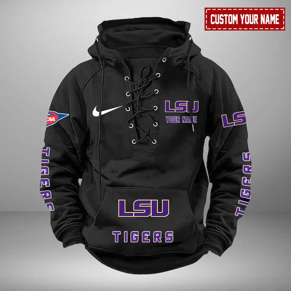 LSU Tigers NCAA Retro Lace Up Hoodie Custom Name Mens Vintage