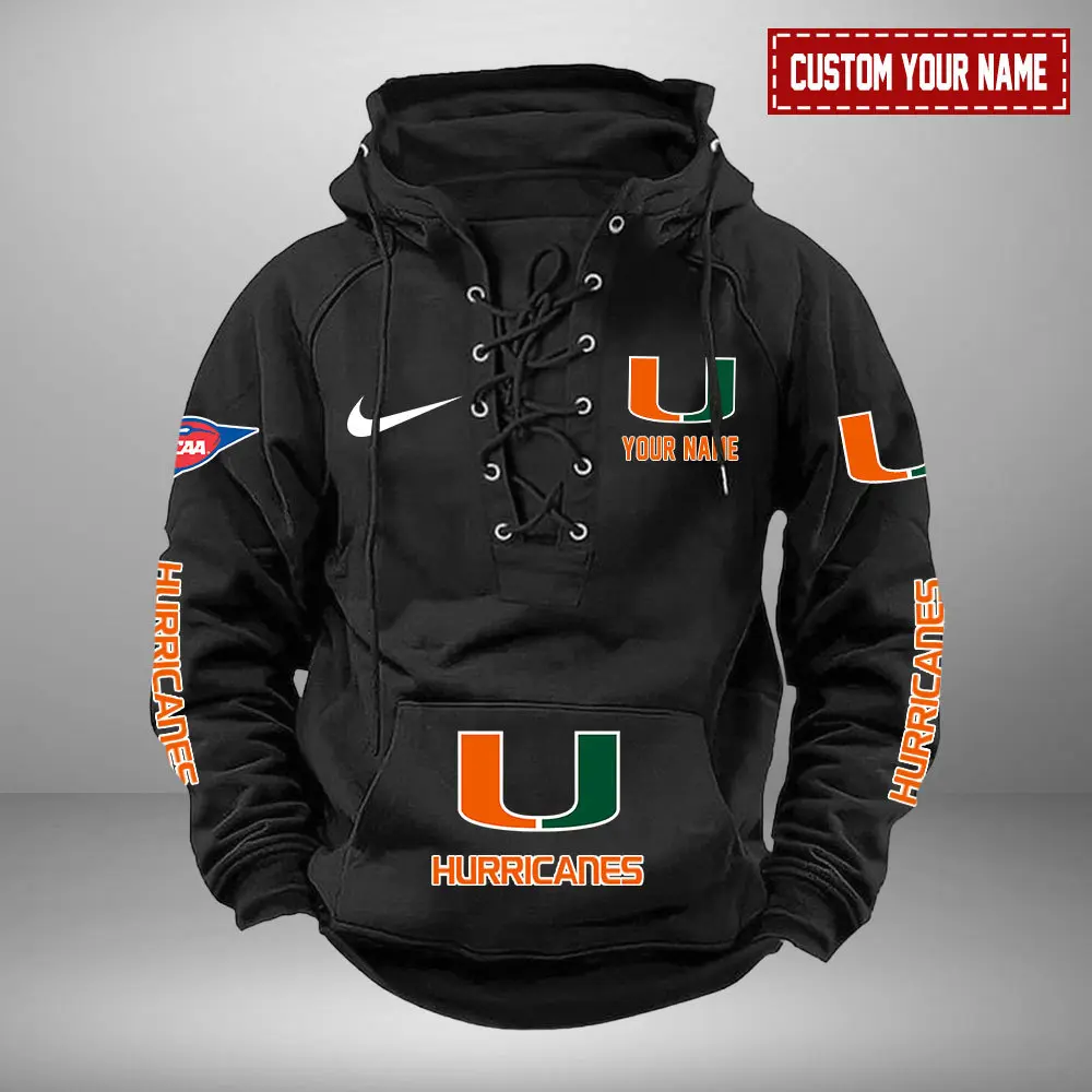 Miami Hurricanes NCAA Retro Lace Up Hoodie Custom Name Mens Throwback