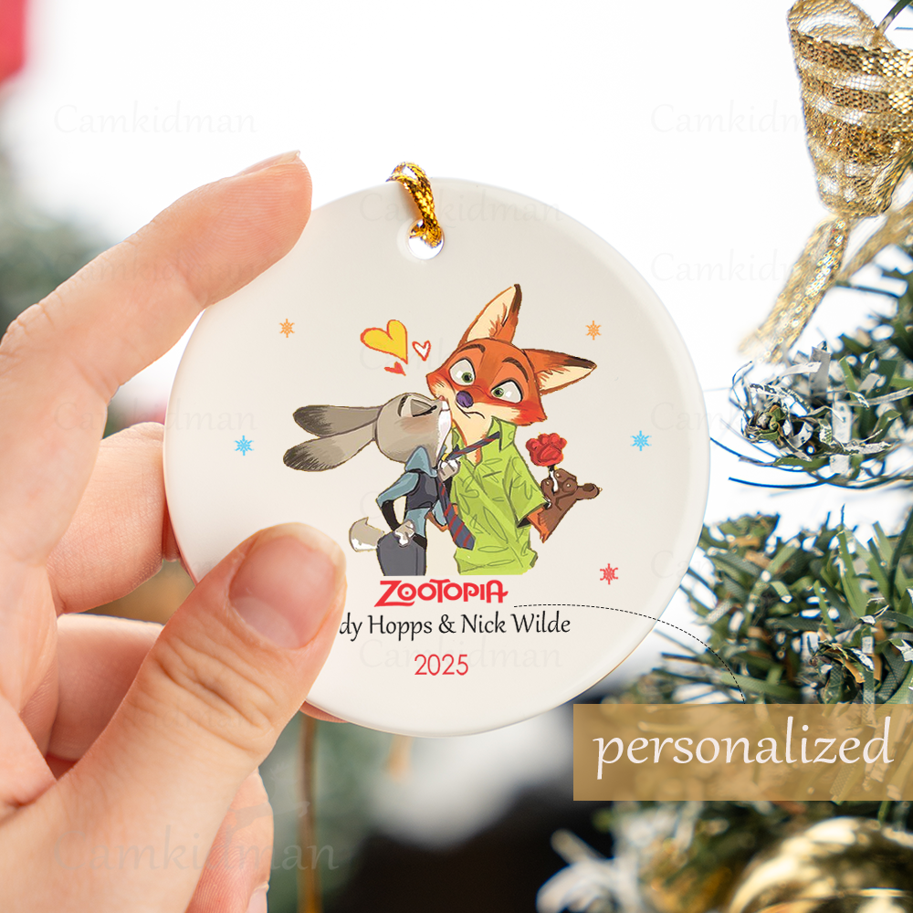Playful Fox Hugging Bunny Round Holiday Decor 2025 Ceramic Christmas Ornament