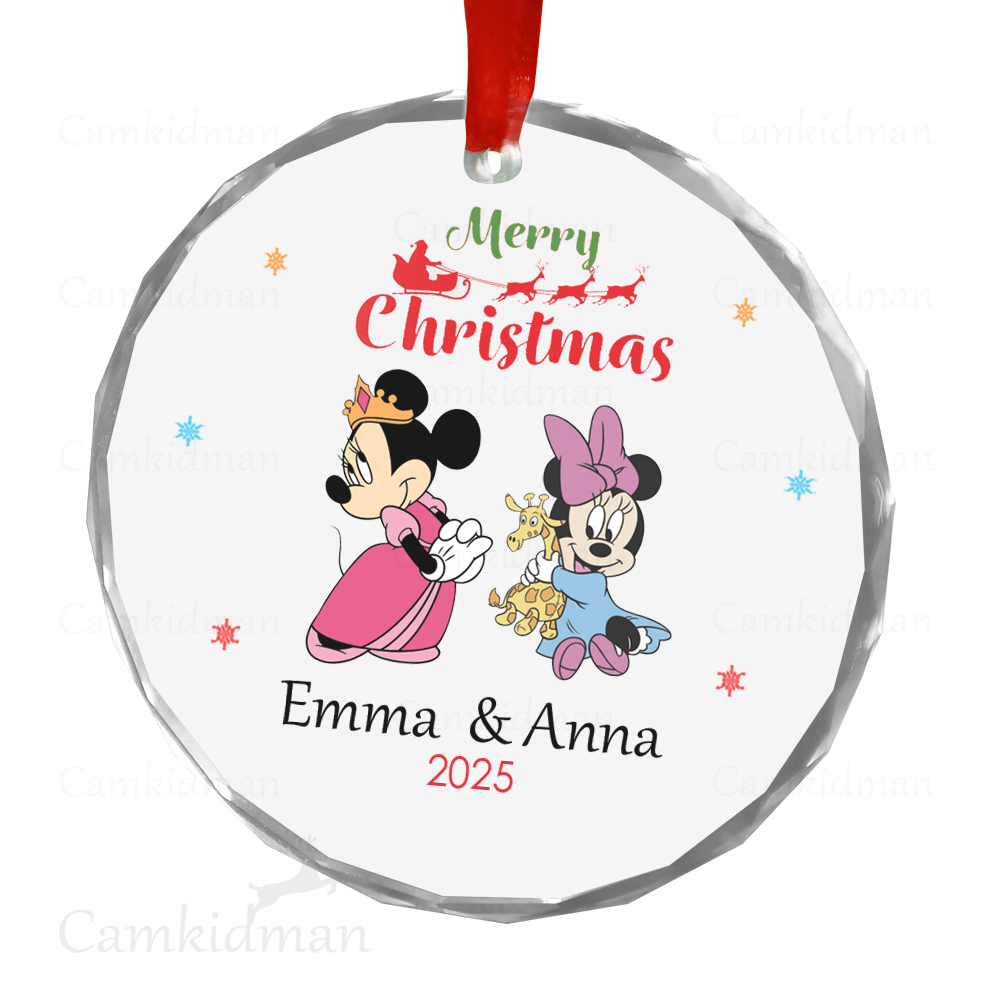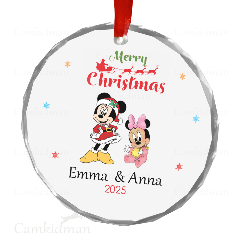Mickey Minnie Couple Sitting Pose Glass Christmas Ornament 2025 Personalized Name tree