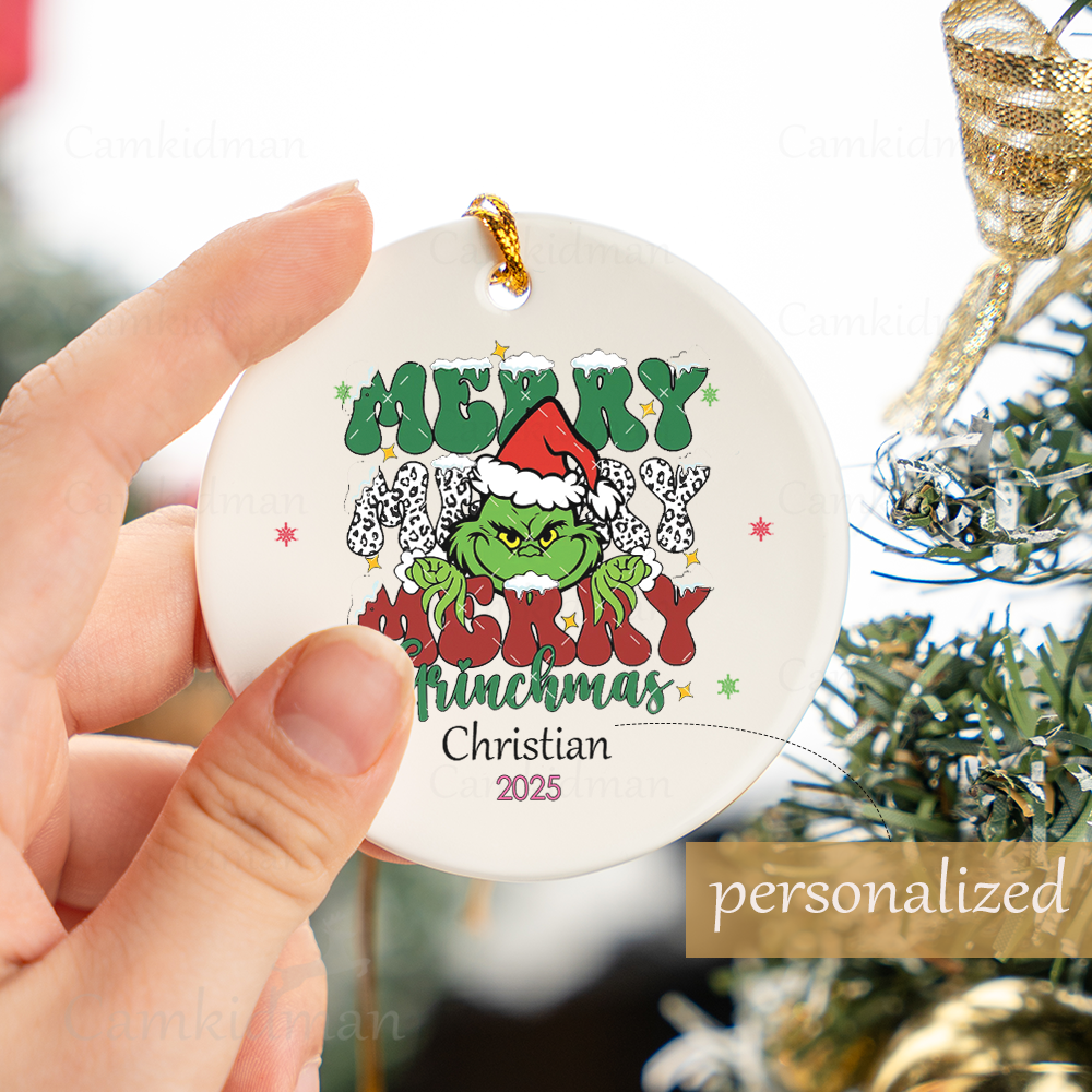 Personalized Name Angry Merry Grinchmas 2025 Glass Christmas Ornament Decoration