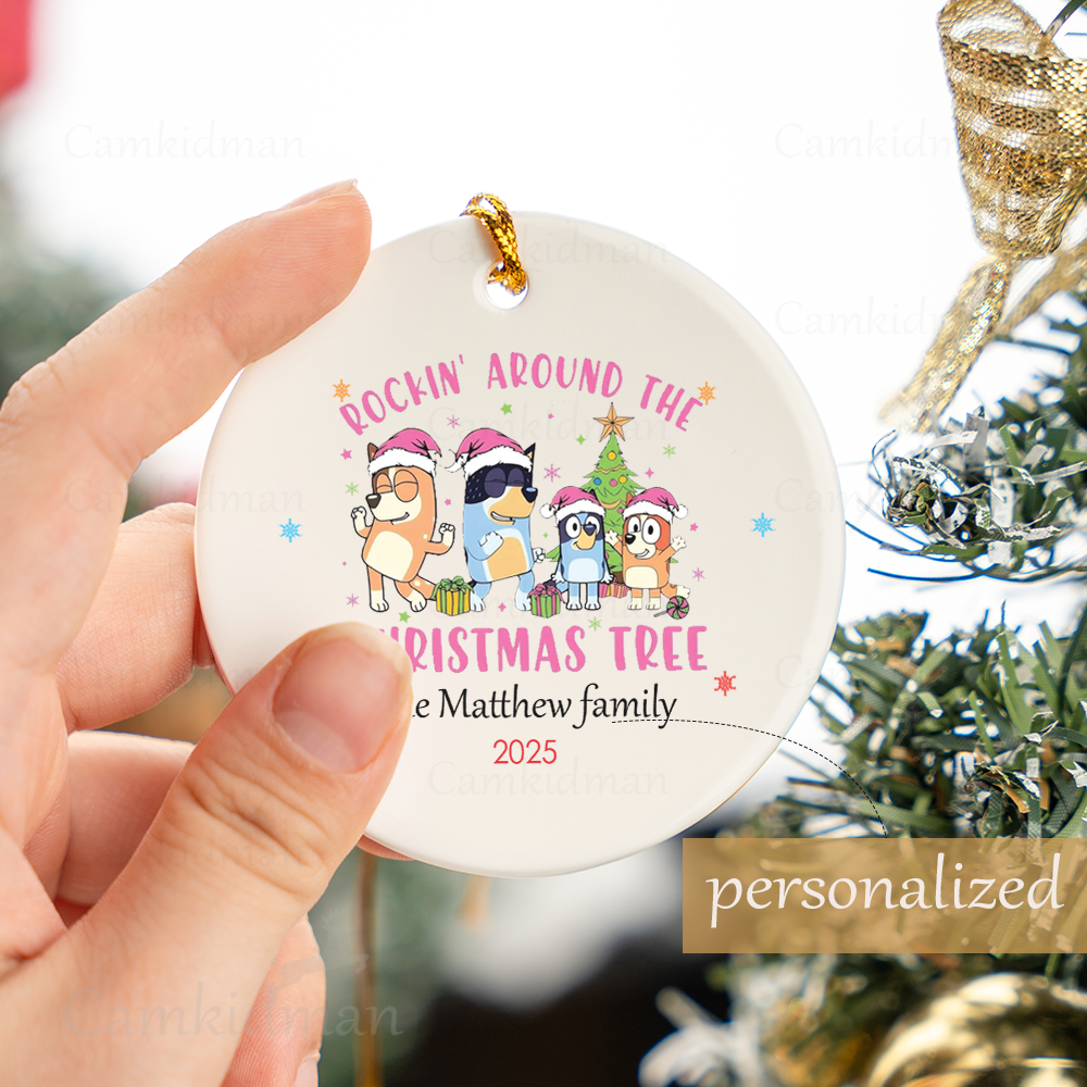 Personalized Name Bluey Pink Family Rockin Around the Christmas Tree 2025 Glass Ceramic Ornament Glass Ornament Decoration