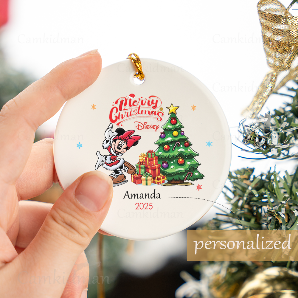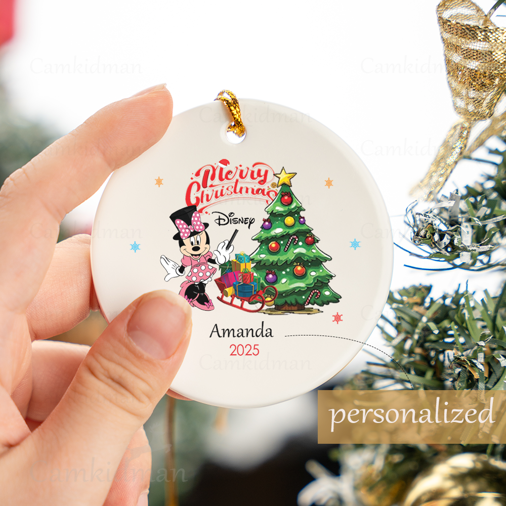 Personalized Name Disney Minnie with Christmas Tree Glass Ceramic Ornament Glass Ornament Decoration