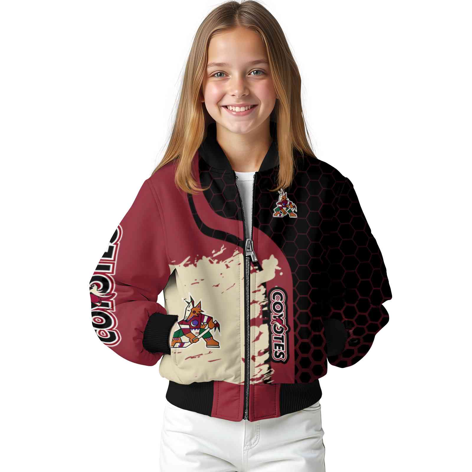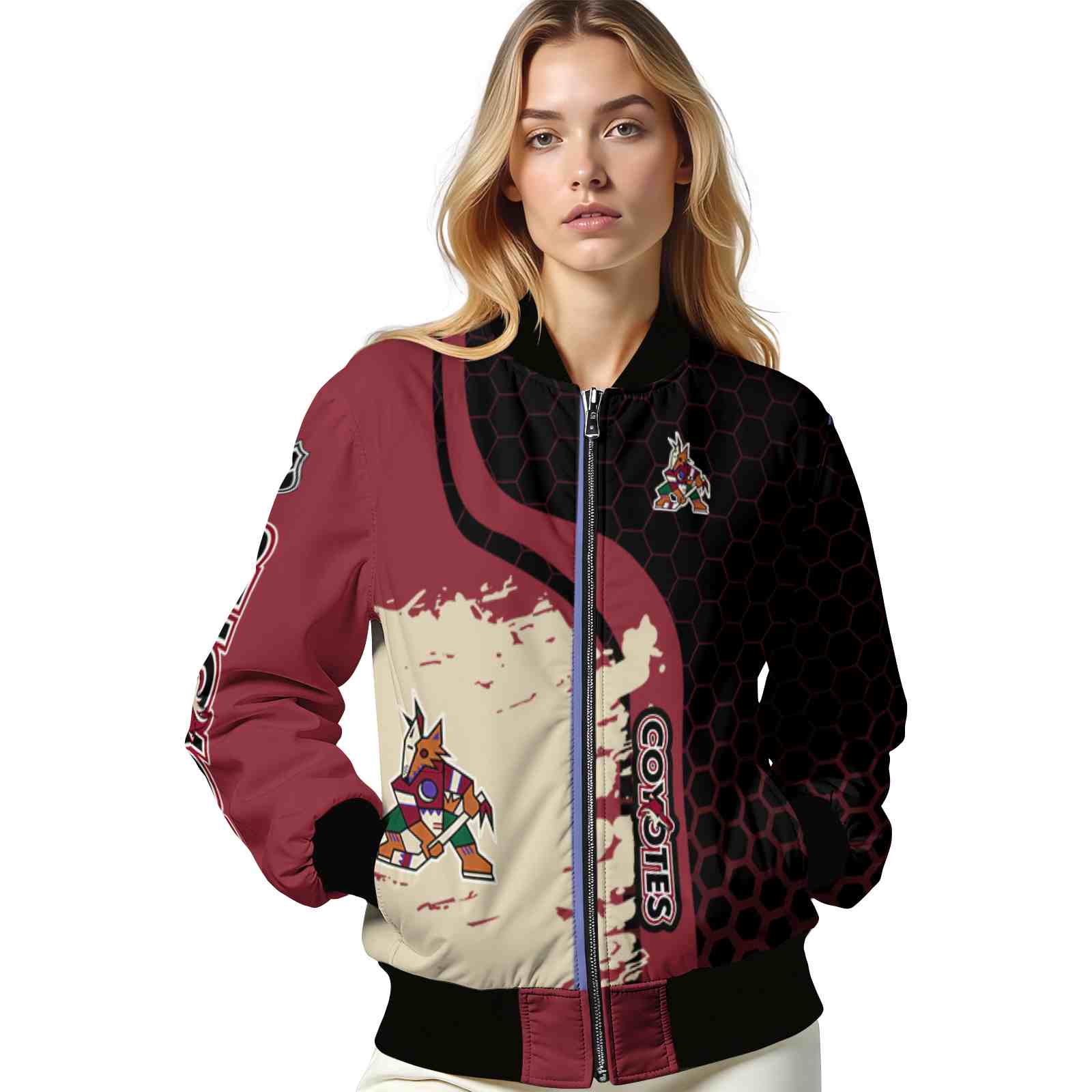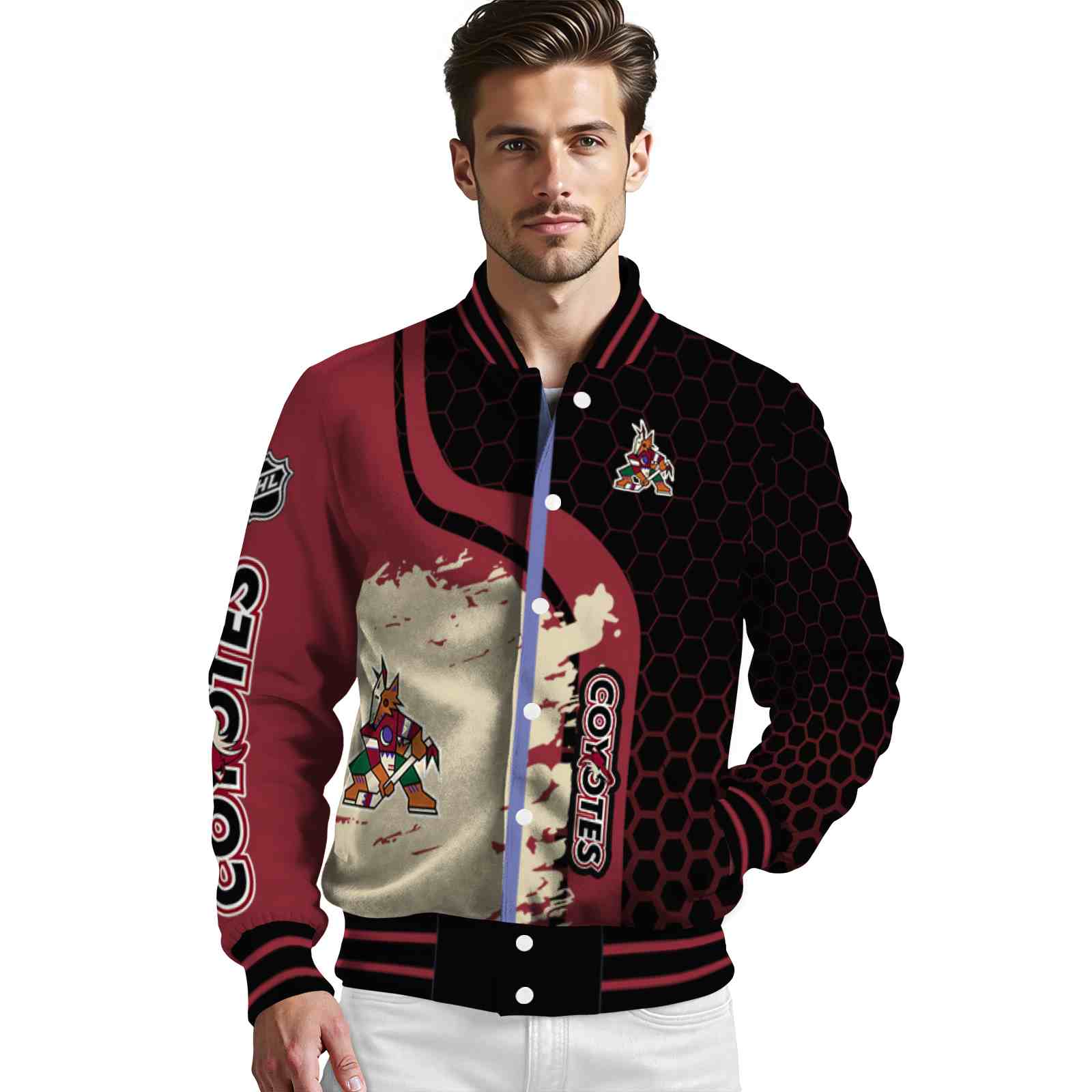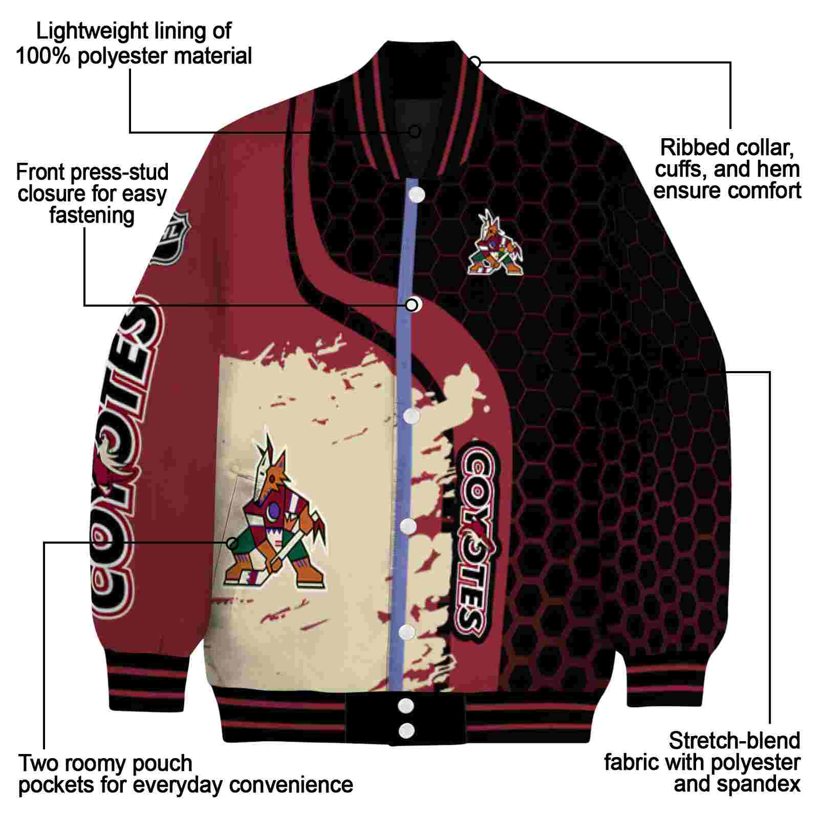 Be the first to review “Arizona Coyotes Hexagonal Pattern Red Black Varsity Jacket”