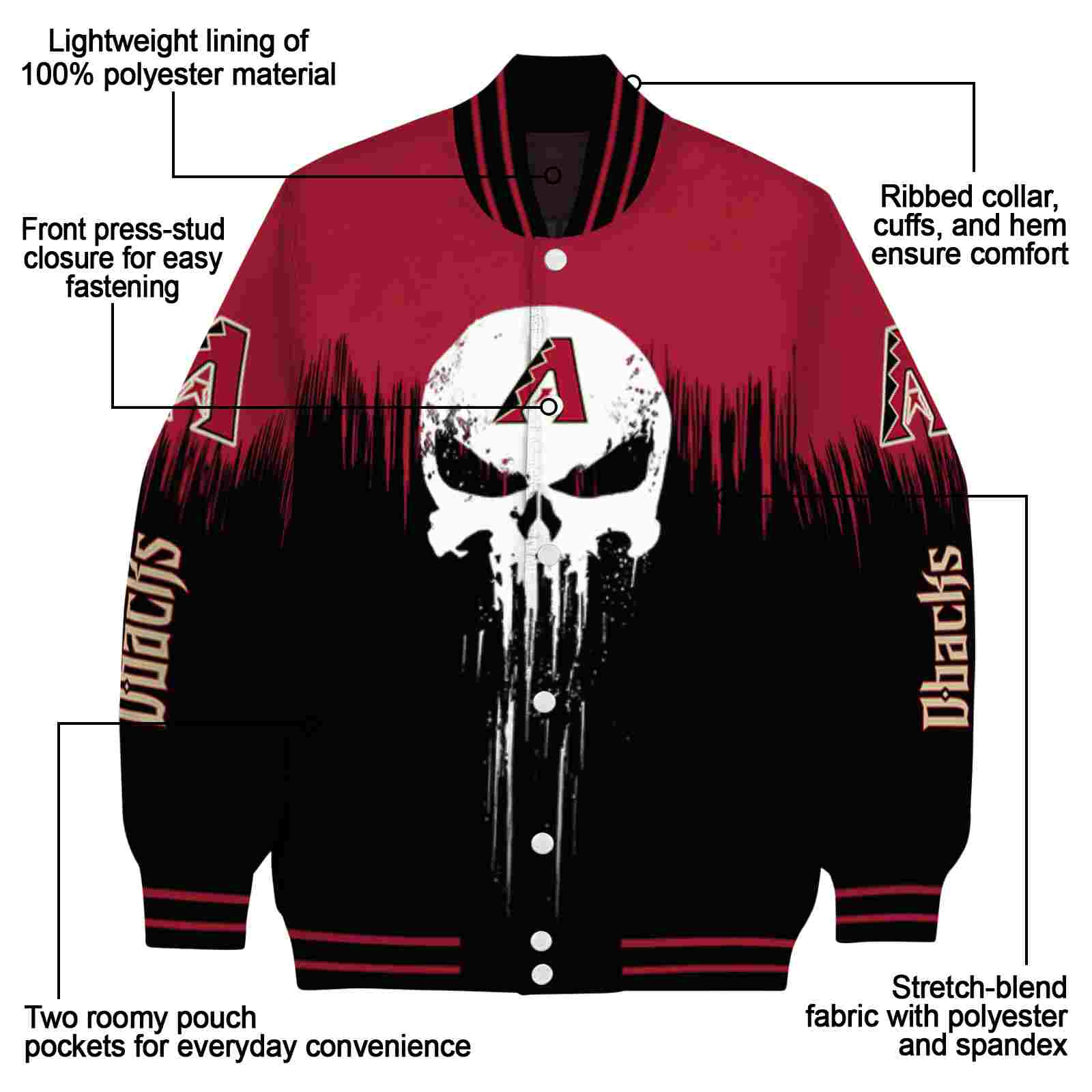 Be the first to review “Arizona Diamondbacks Punisher Skull Red Black White Varsity Jacket”