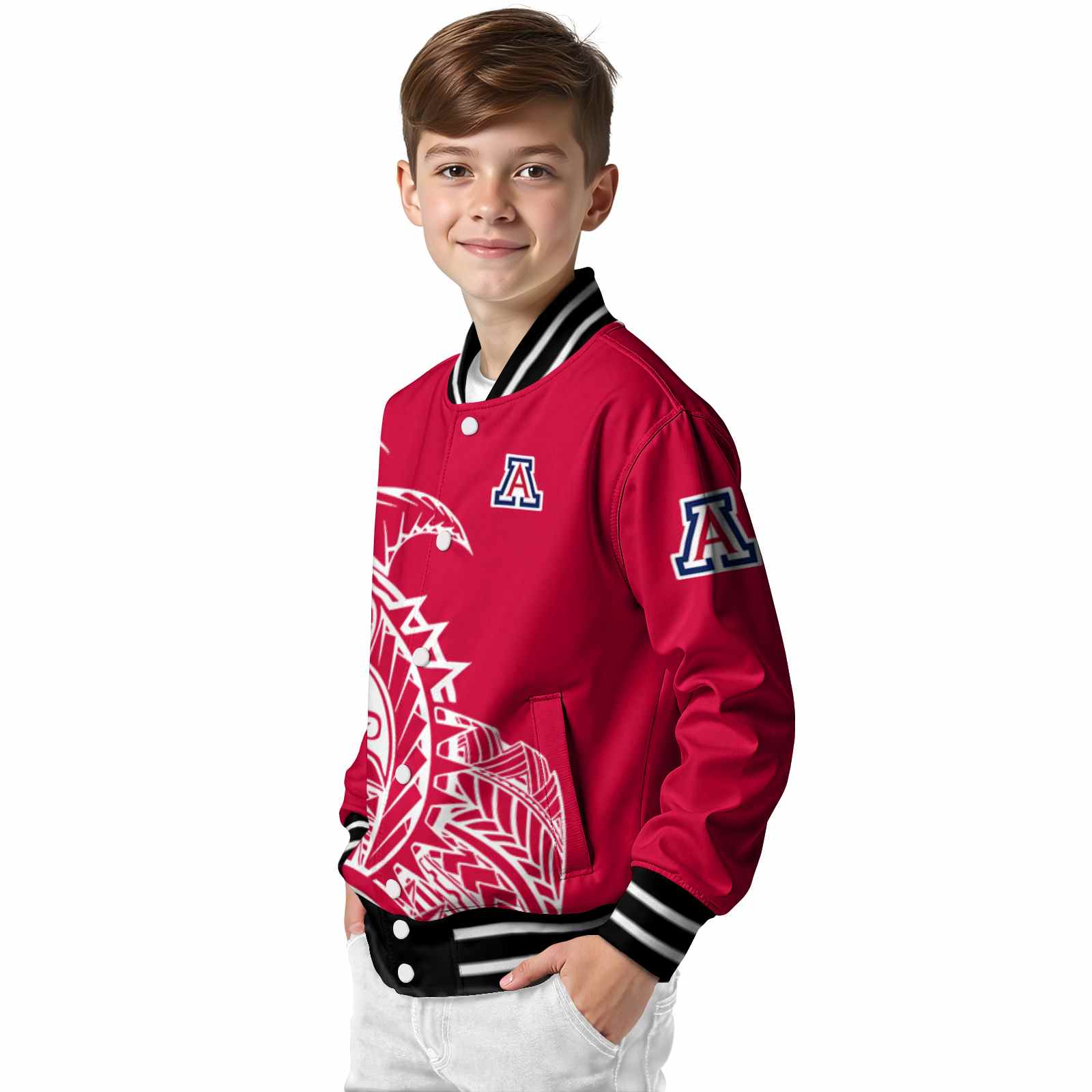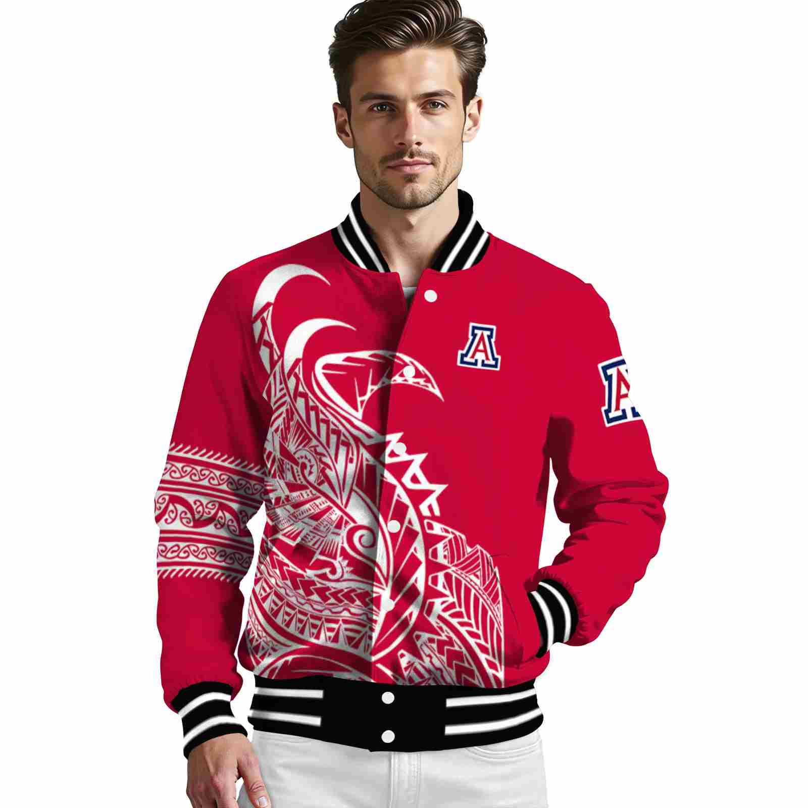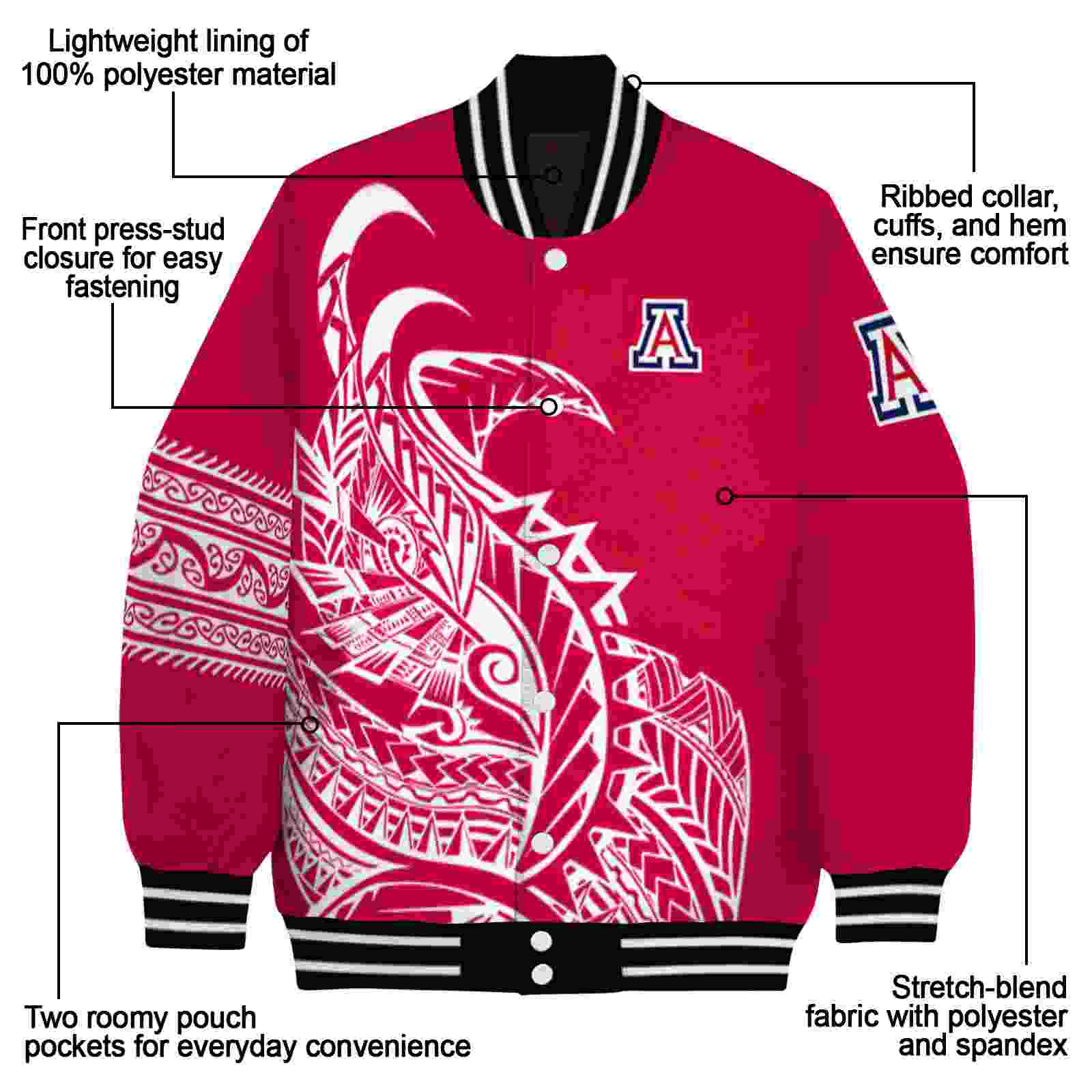 Be the first to review “Arizona Wildcats Tribal Art Red White Black Varsity Jacket”