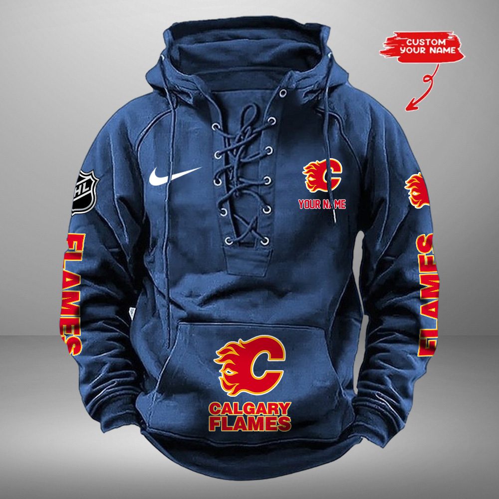 Calgary Flames NHL Retro Lace Up Hoodie Custom Name Mens Throwback