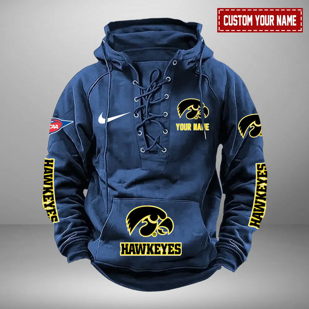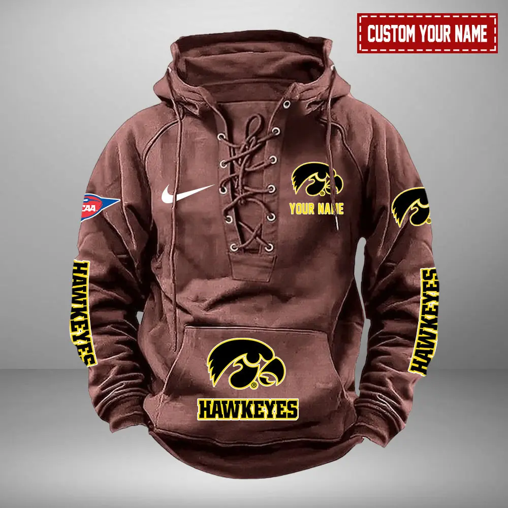 Iowa Hawkeyes NCAA Retro Lace Up Hoodie Custom Name Mens Throwback