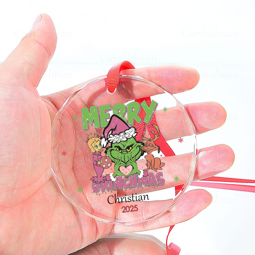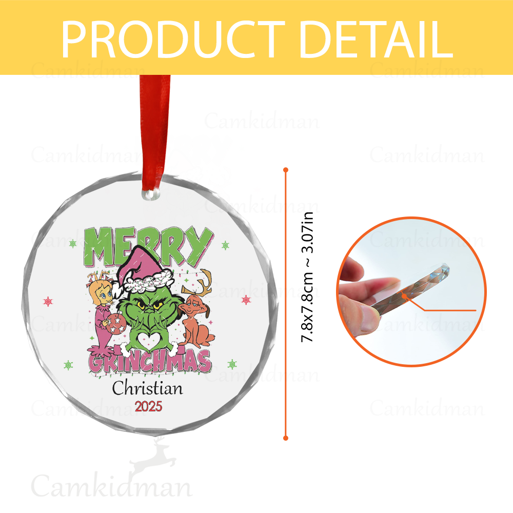 Merry Grinchmas Cartoon Style 2025 Round Glass Christmas Ornament 2025 Personalized Name