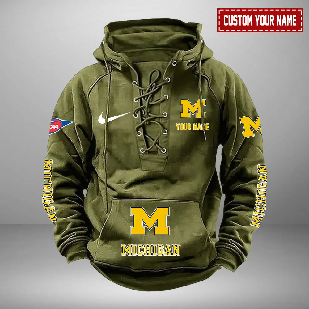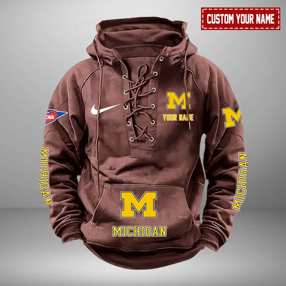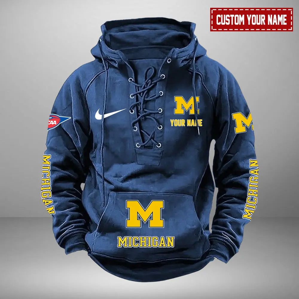 Michigan Wolverines NCAA Retro Lace Up Hoodie Custom Name Mens Vintage