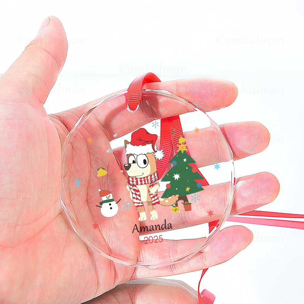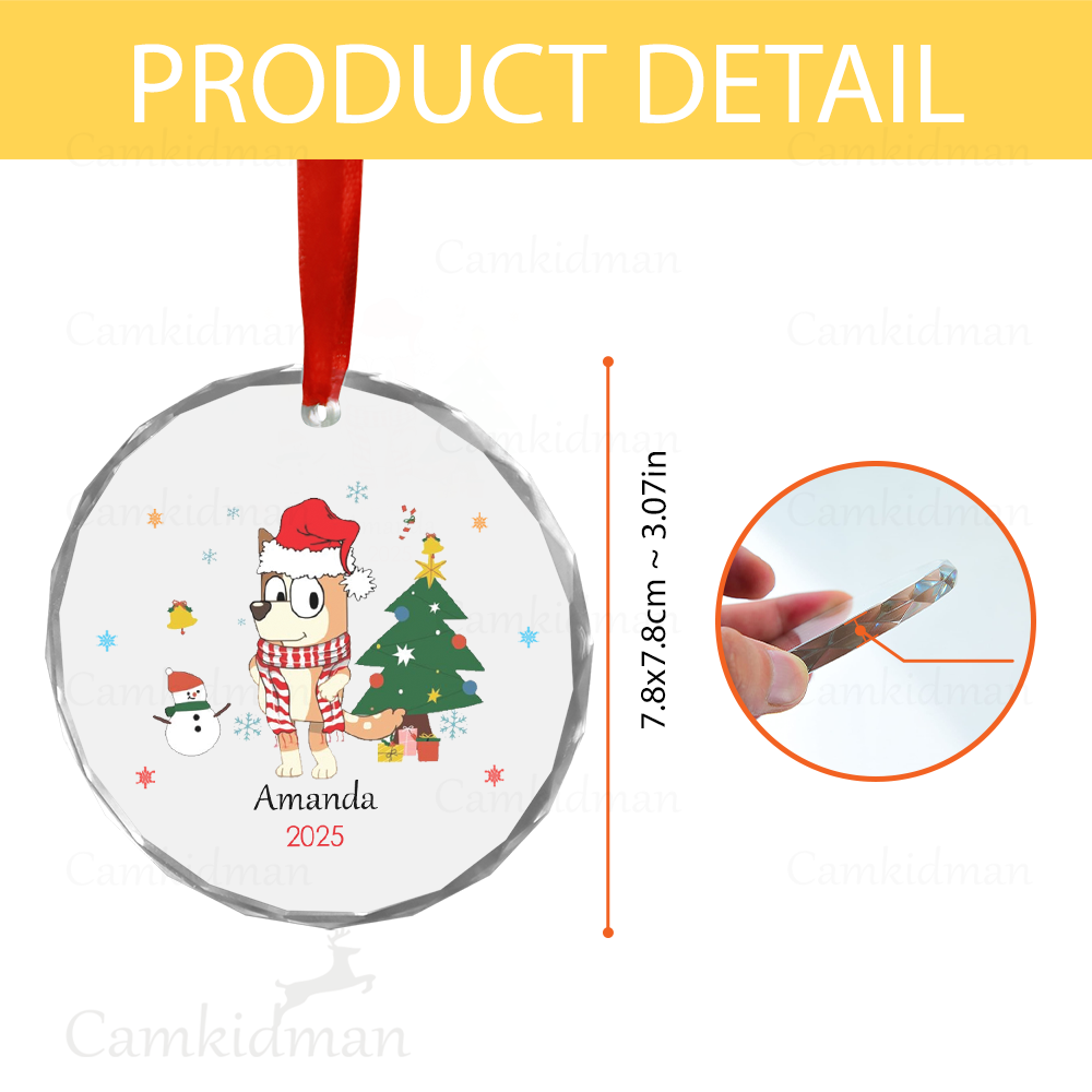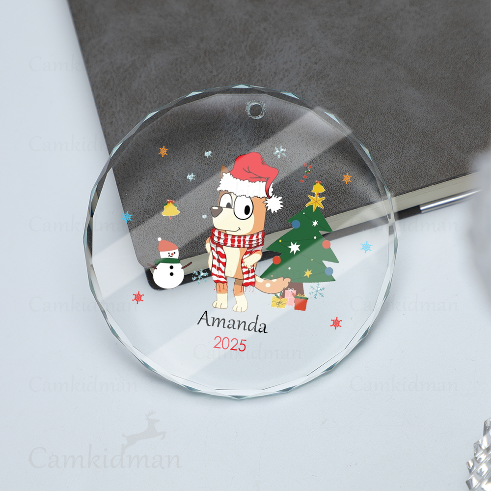 Personalized Name Bluey and Bingo Christmas Couple 2025 Glass Round Glass Ornament Holiday Keepsake