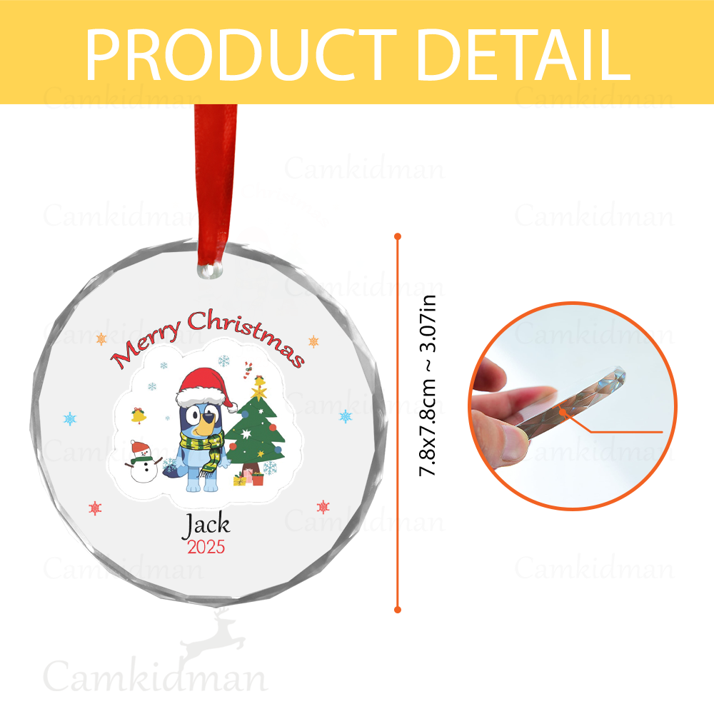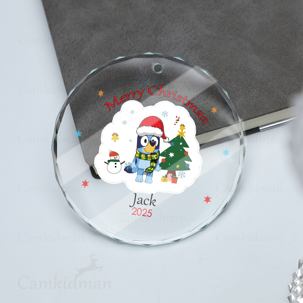 Personalized Name Bluey and Family with Christmas Tree 2025 Glass Holiday Glass Ornament Decoration