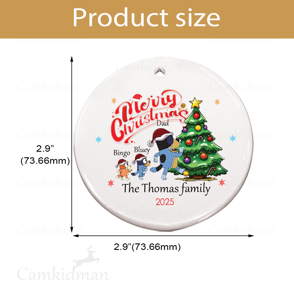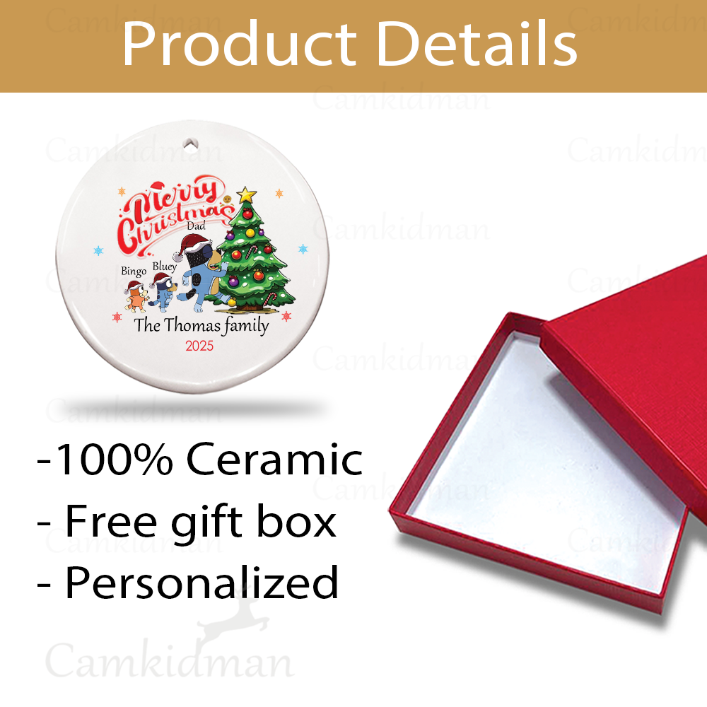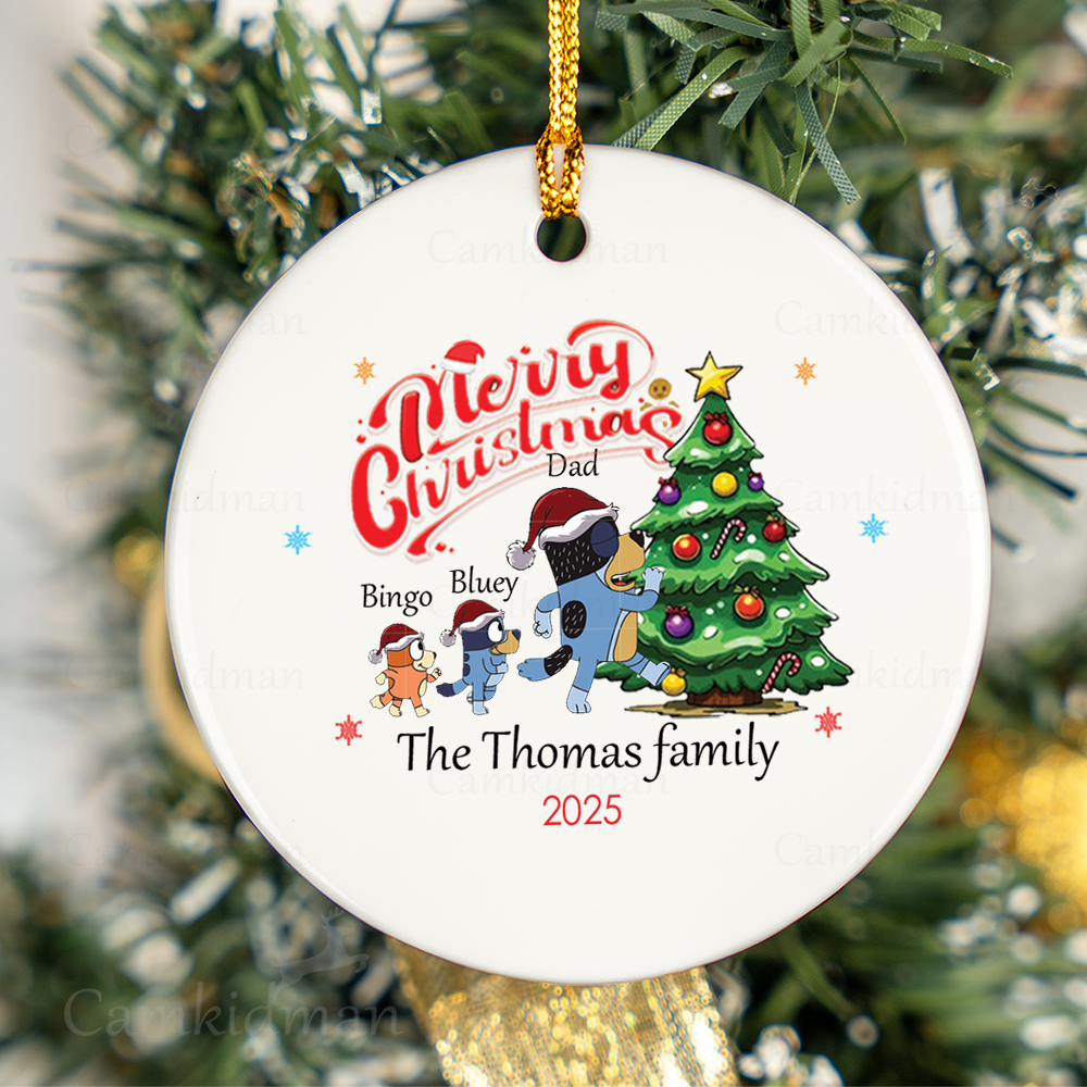 Personalized Name Bluey Bingo dad family with Christmas Tree Glass Ceramic Ornament Glass Ornament