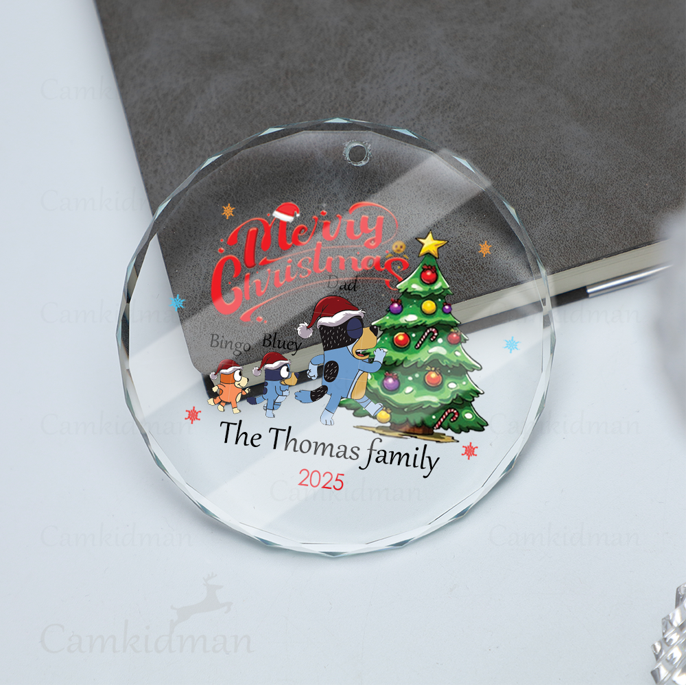 Personalized Name Bluey Bingo dad family with Christmas Tree Glass Glass Ornament