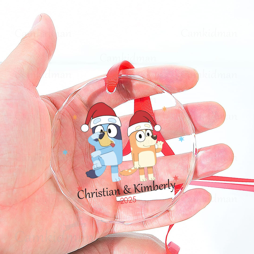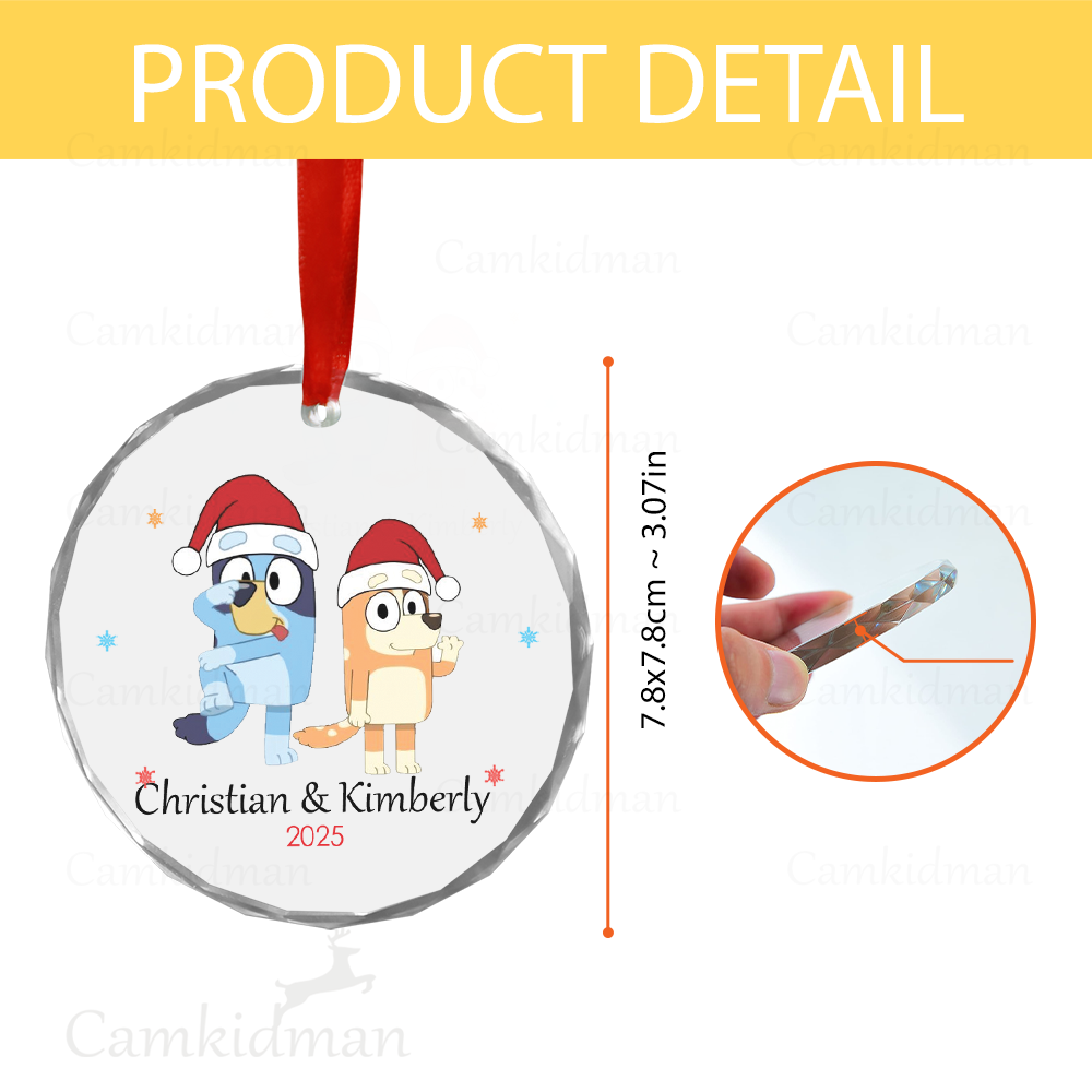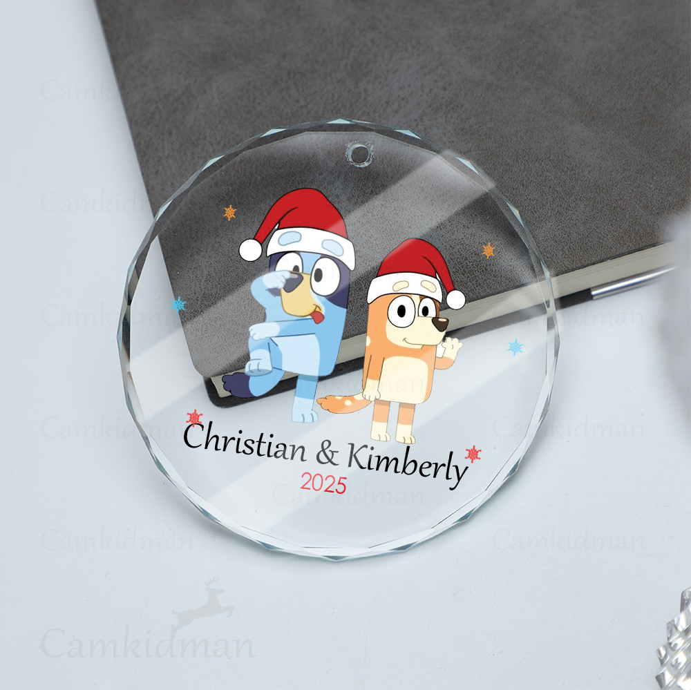 Personalized Name Bluey Character with Snowman and Tree 2025 Glass Christmas Ornament