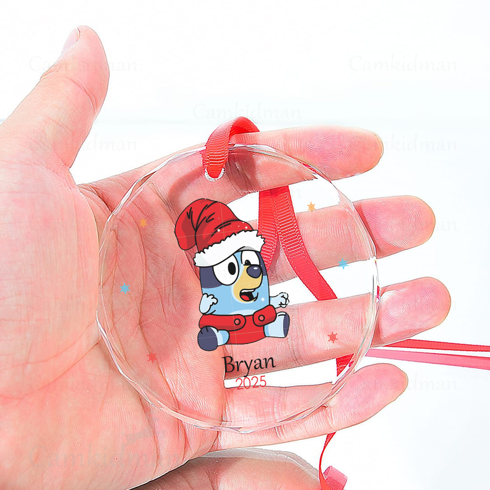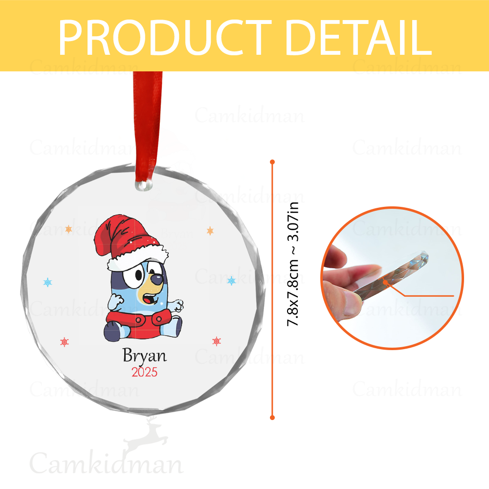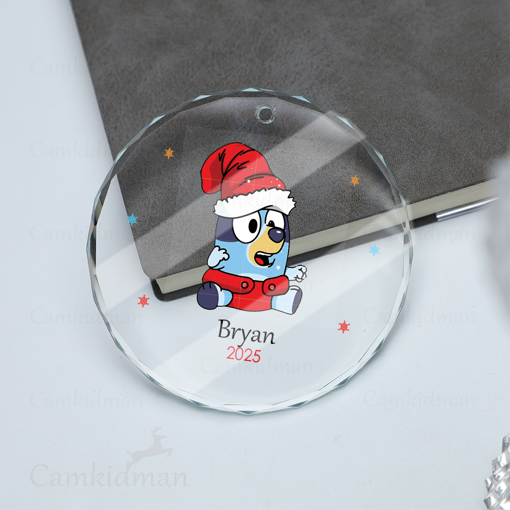 Personalized Name Bluey Puppy With Santa Hat 2025 Christmas Glass Ornament gifts