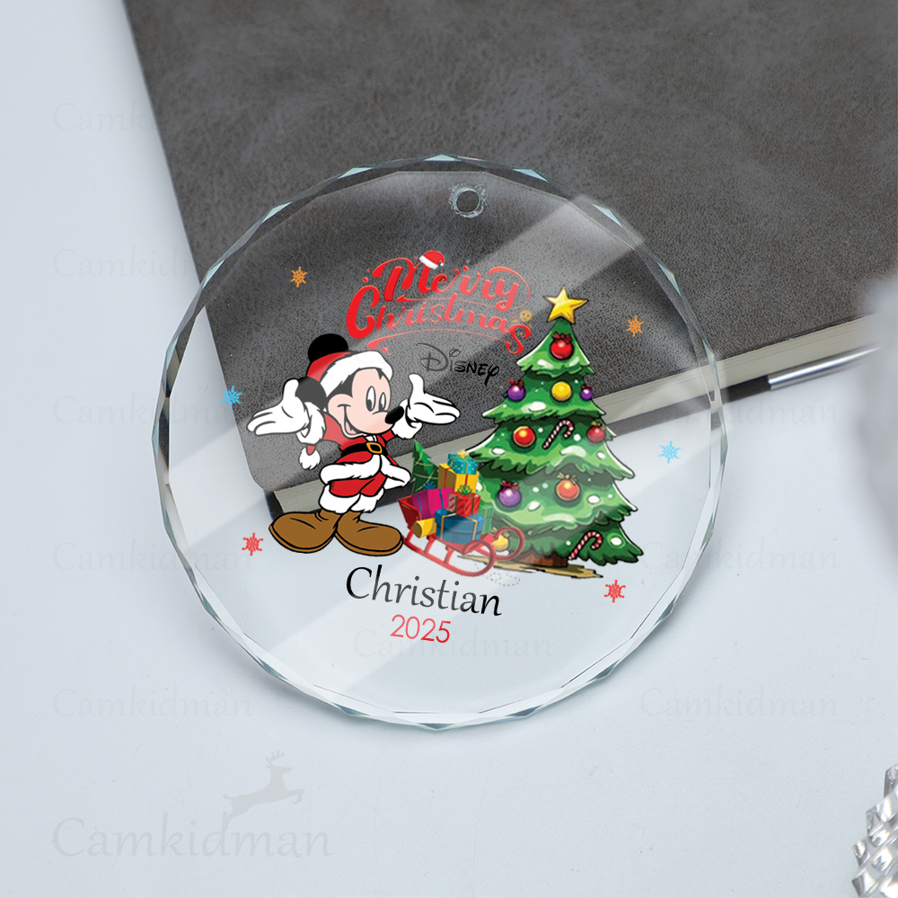 Personalized Name Disney Mickey with Christmas Tree Glass Glass Ornament Decoration