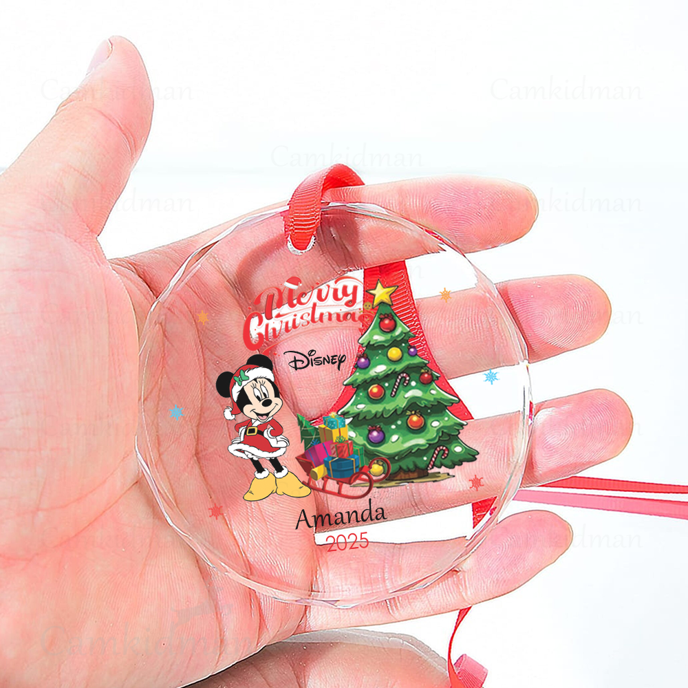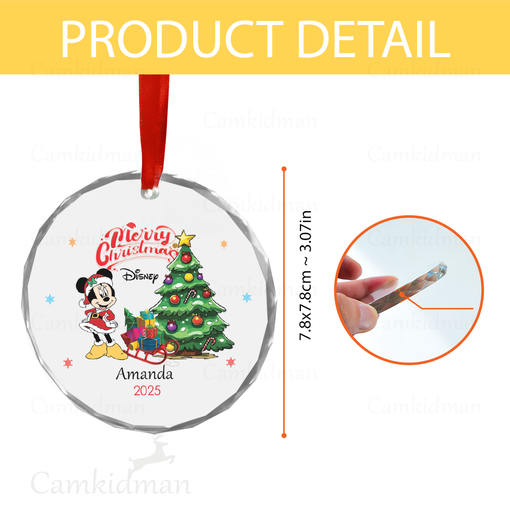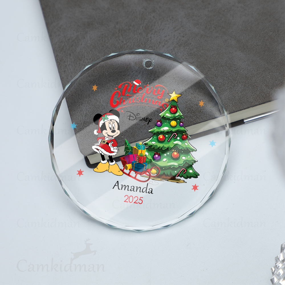 Personalized Name Disney Mickey with Christmas Tree Glass Ornament