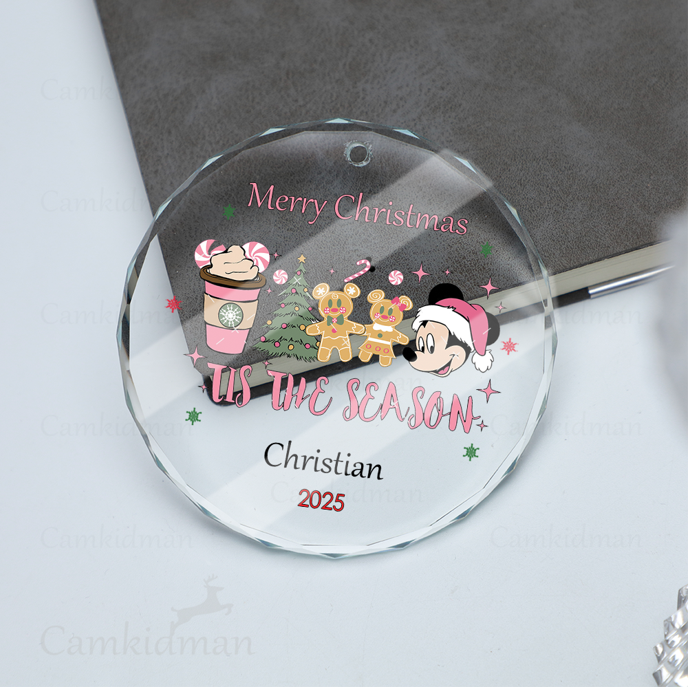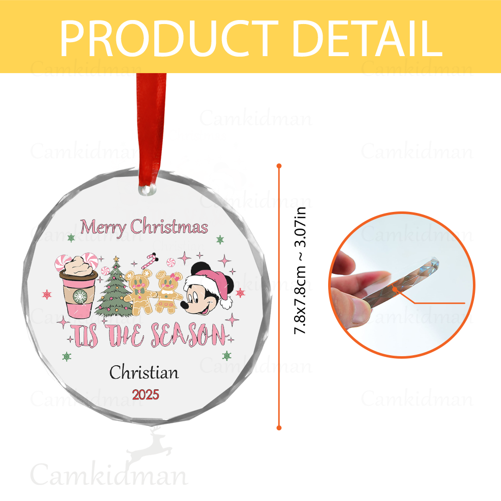 Personalized Name Disney Minnie and Mickey Tis the Season 2025 Glass Christmas Ornament