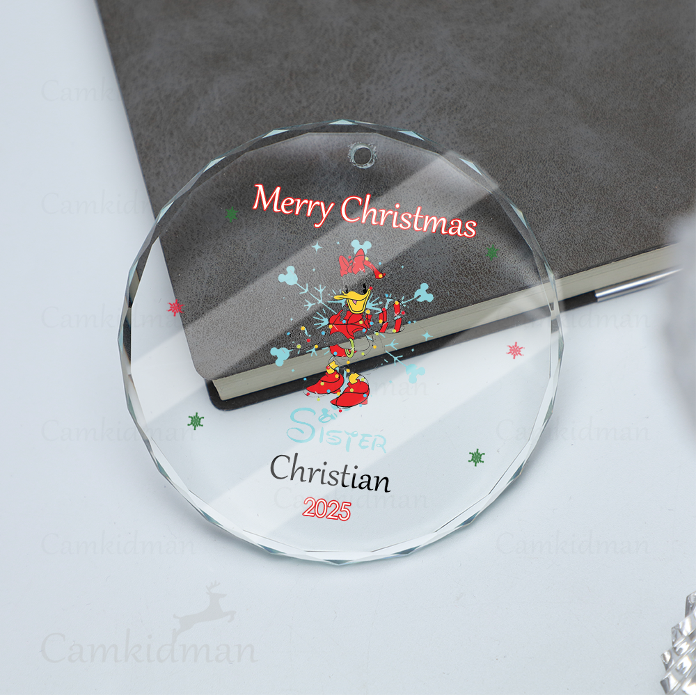 Personalized Name Disney Minnie Mouse Sister 2025 Glass Round Holiday Ornament