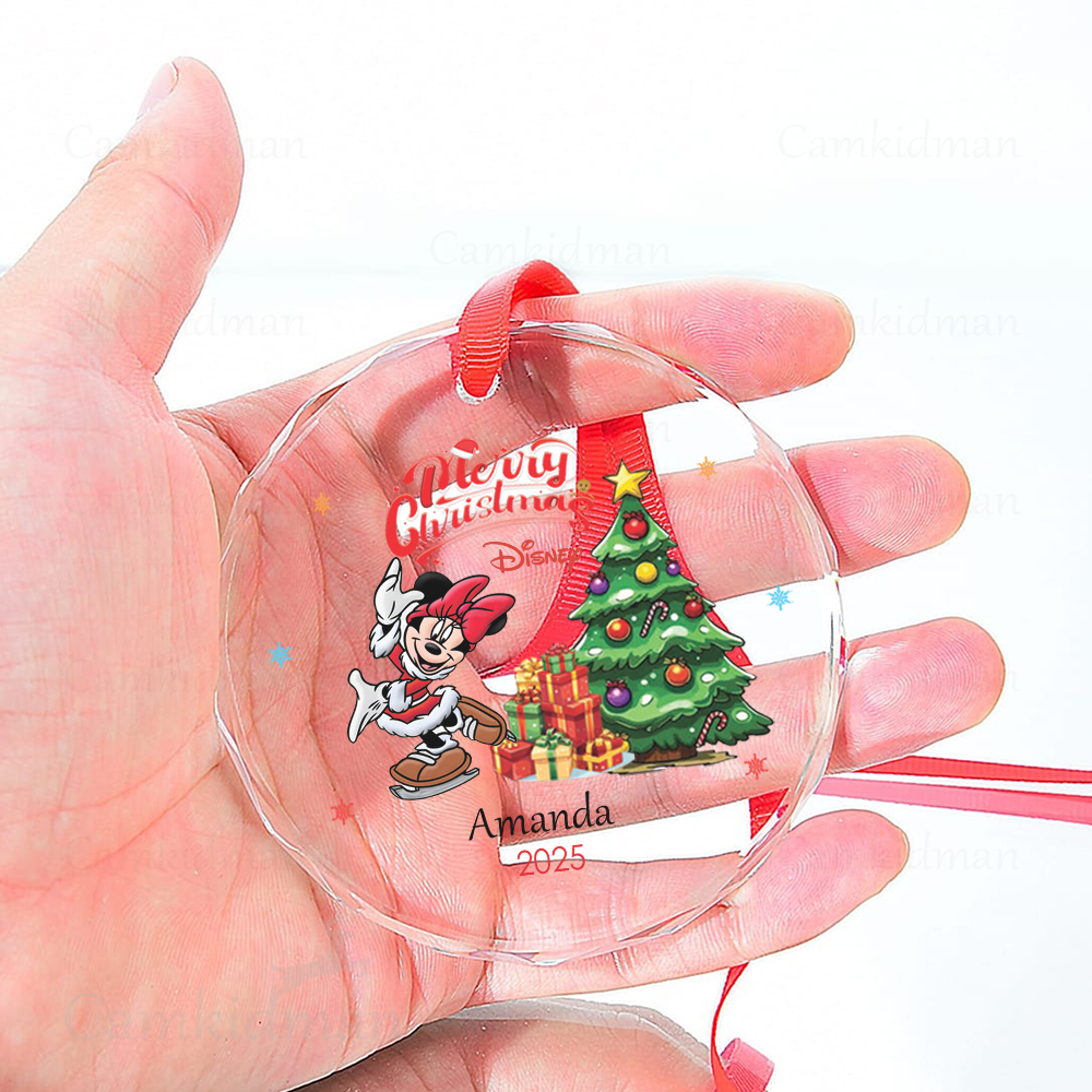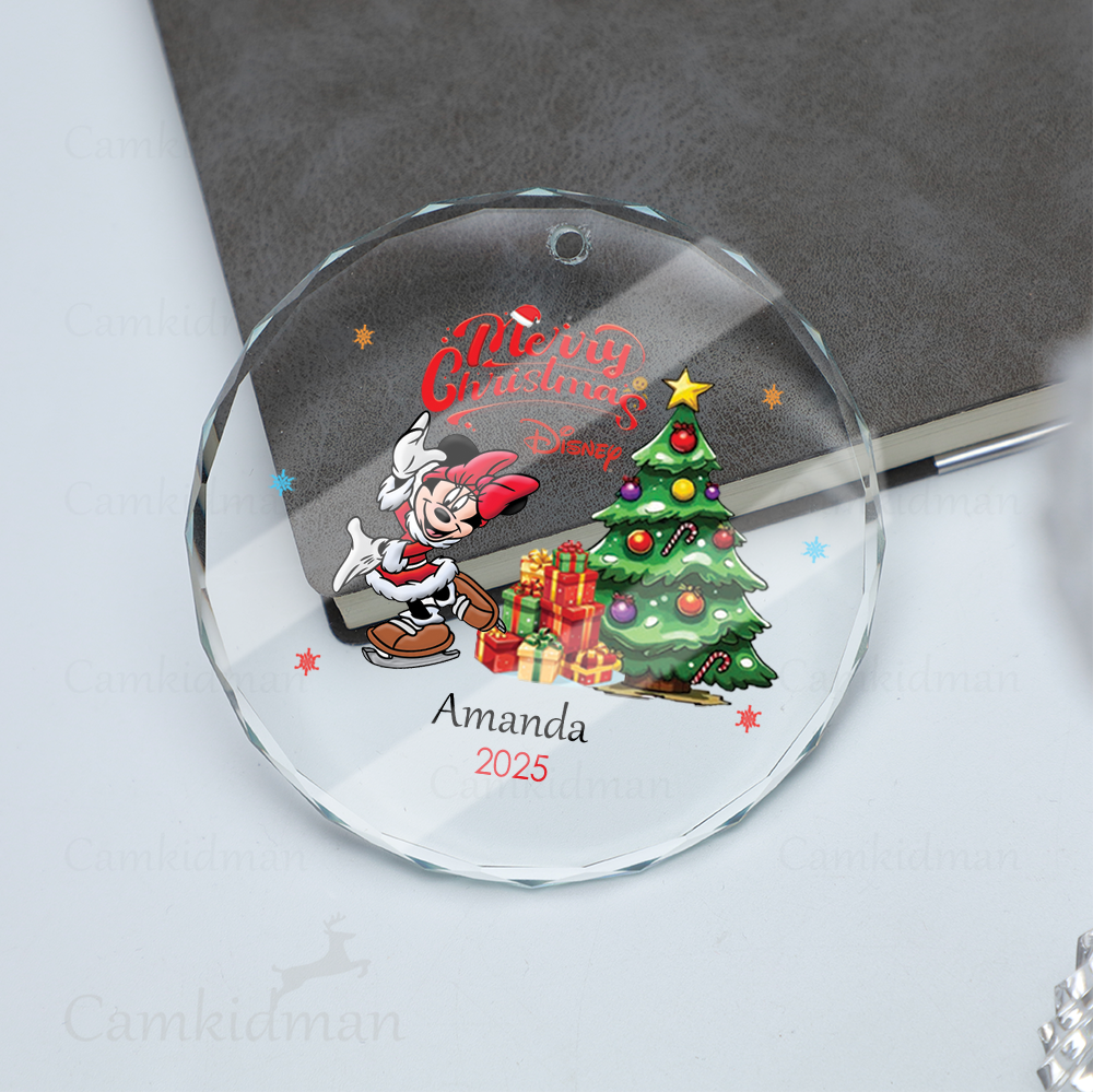 Personalized Name Disney Minnie with Christmas Tree Glass Glass Ornament