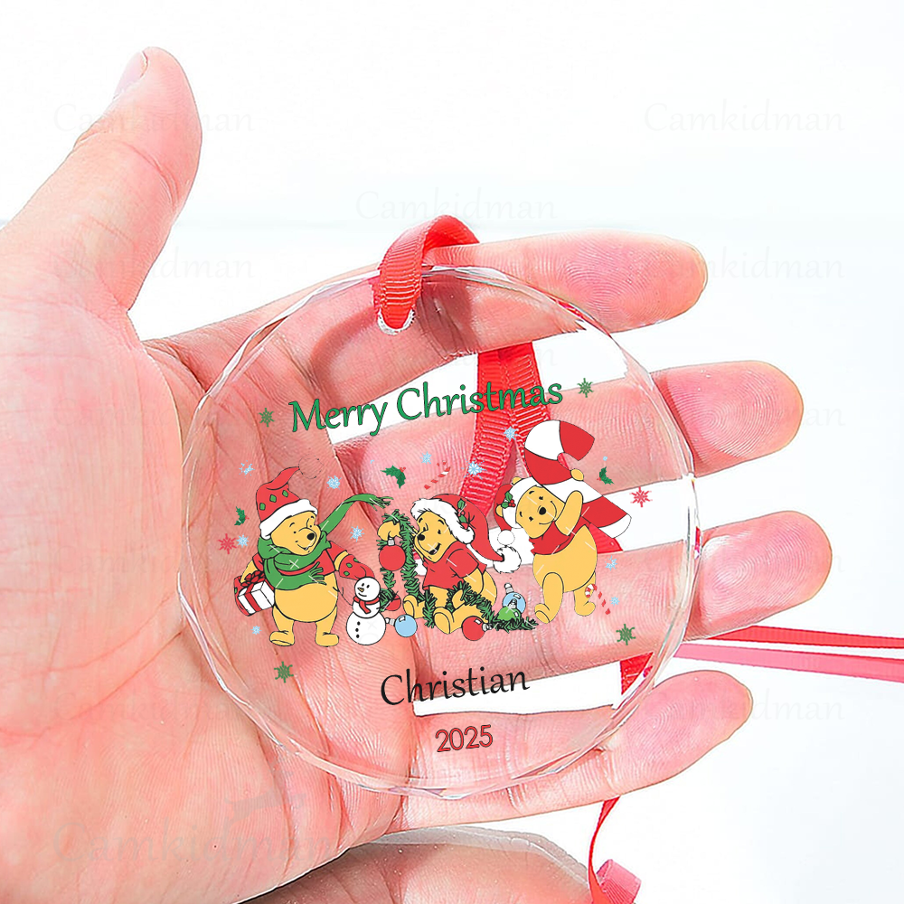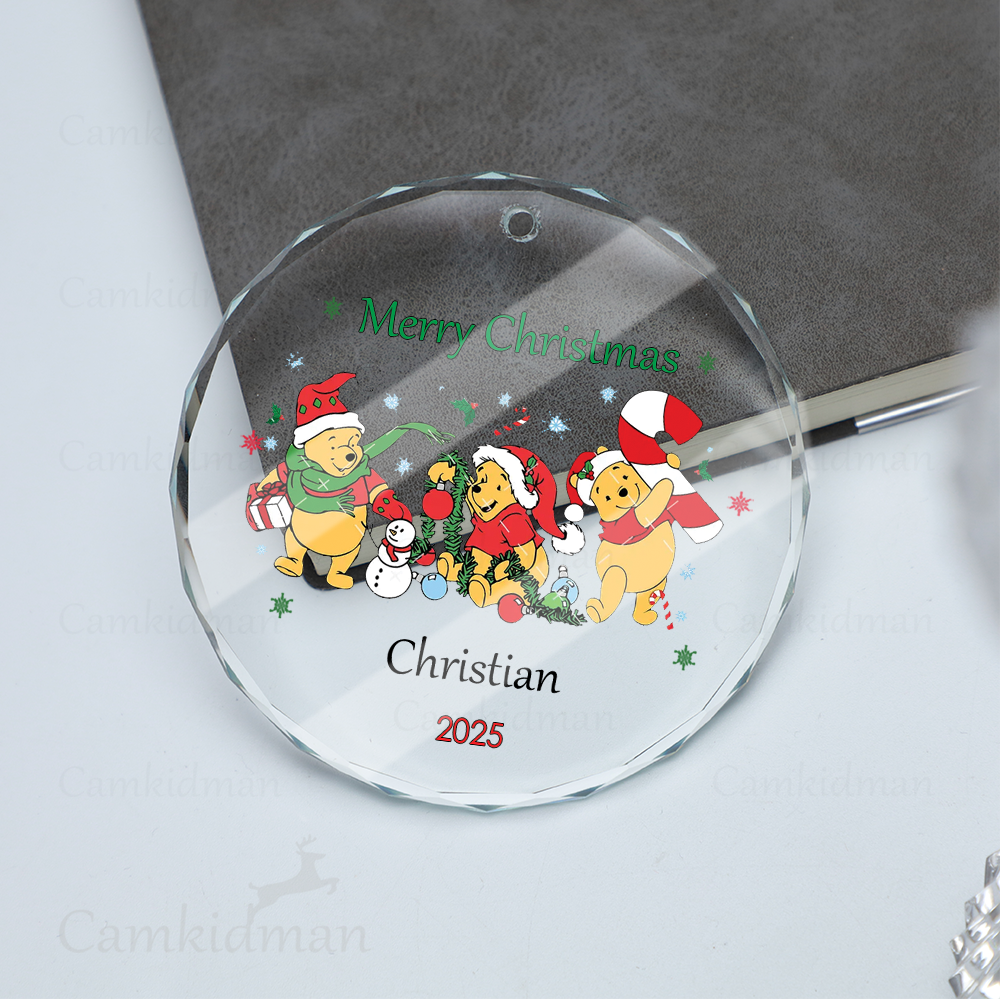 Personalized Name Disney Winnie the Pooh and Friends Christmas 2025 Glass Round Ornament